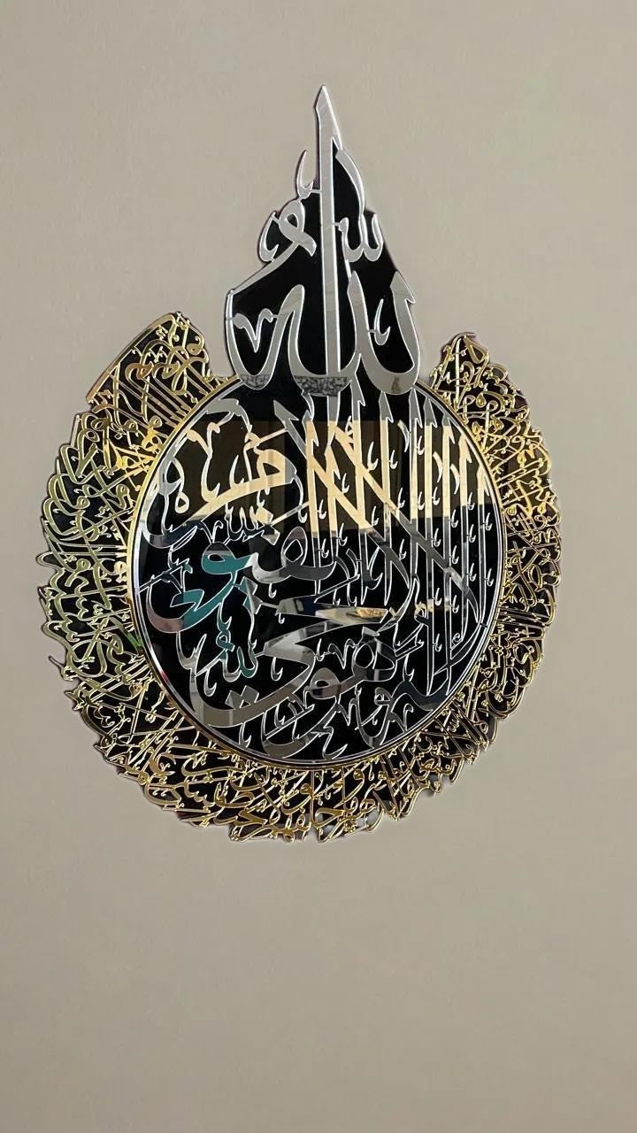 لوحة جدارية اية الكرسي مقاس ٧٥*٨٥ سم سماكة ٦ ملم أسود للخلفيه +٢ملم ذهبي +٢ ملم فضي مثبت علي الواجهة( إجمالي السماكات ٨ مل )
